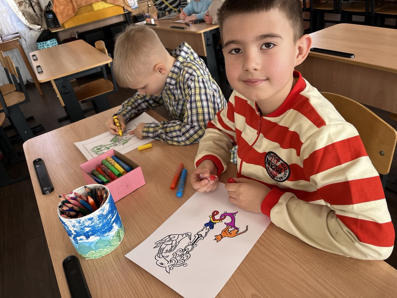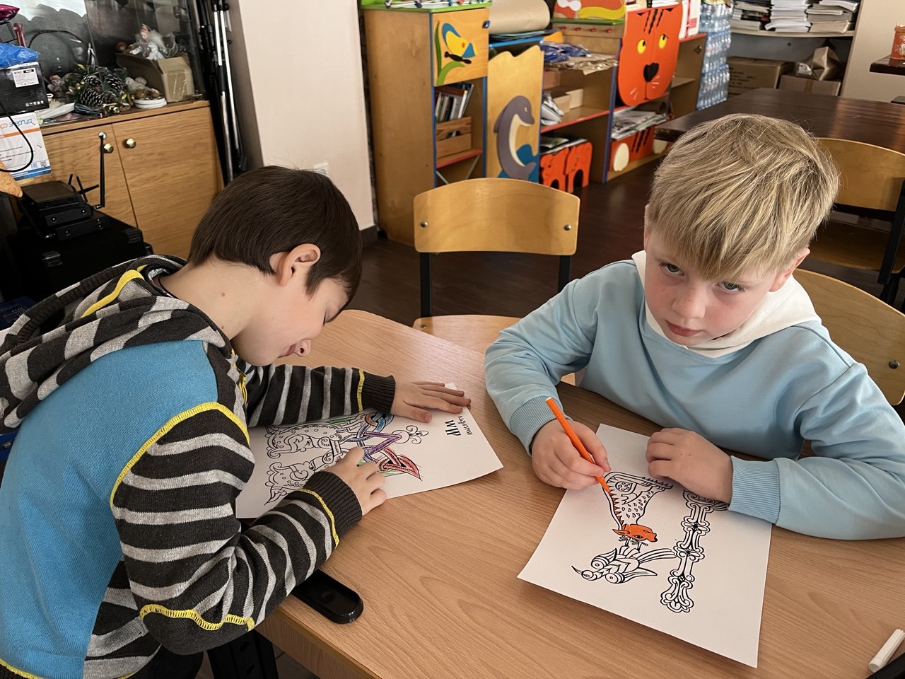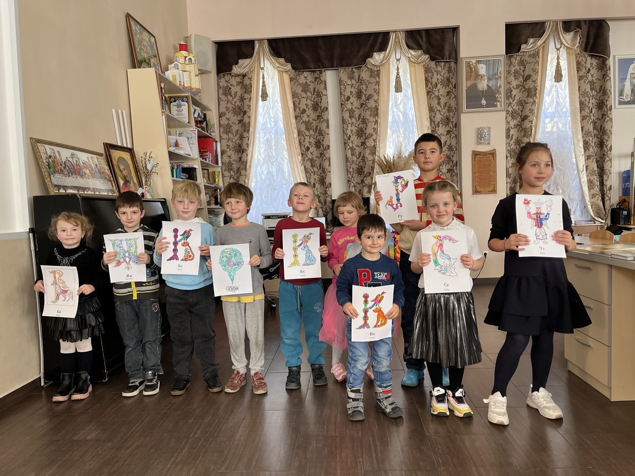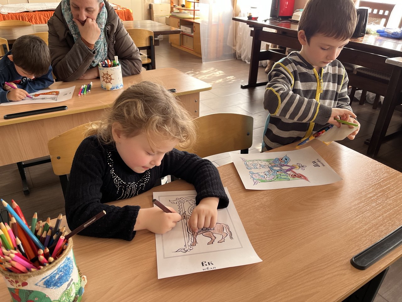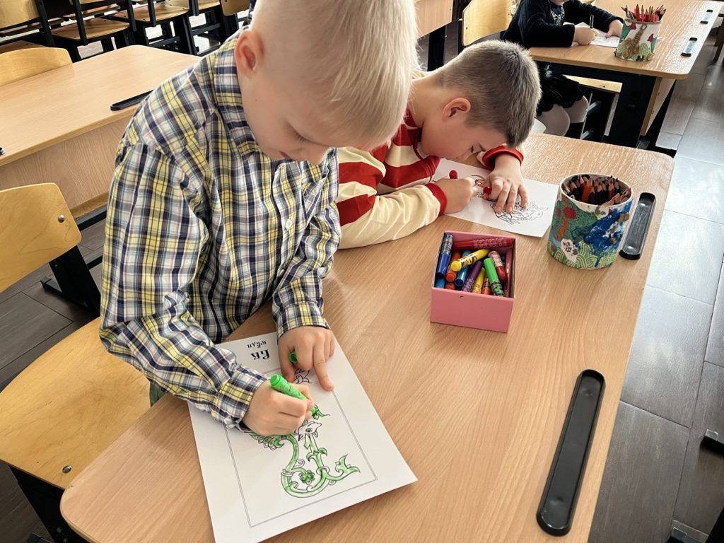 Творческая часть занятия позволила детям почувствовать себя древними мастерами-книжниками. Ребята раскрашивали буквицы — украшенные заглавные буквы, которыми начинались тексты рукописных книг XI–XVII веков. С большим увлечением они создавали яркие орнаменты и узоры, открывая для себя красоту древнерусской книжной традиции.