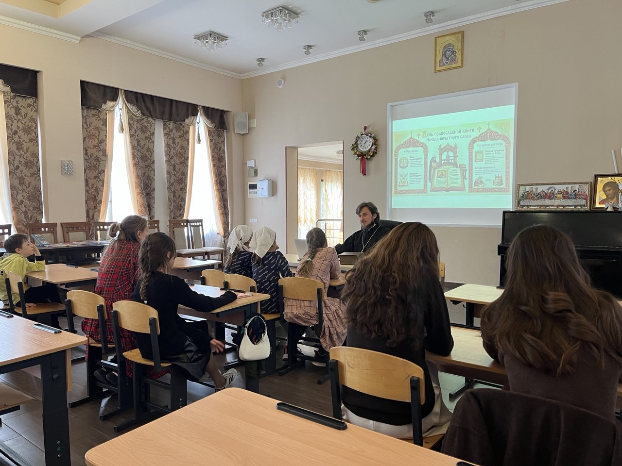 Во время беседы учащиеся вместе со священником совершили своеобразное путешествие в прошлое, вспоминая подвиг первопечатника Ивана Фёдорова и историю появления первой печатной книги на Руси — «Апостола», изданного в 1564 году. Отец Иоанн рассказал о значении книгопечатания для распространения Слова Божия и духовного просвещения народа.