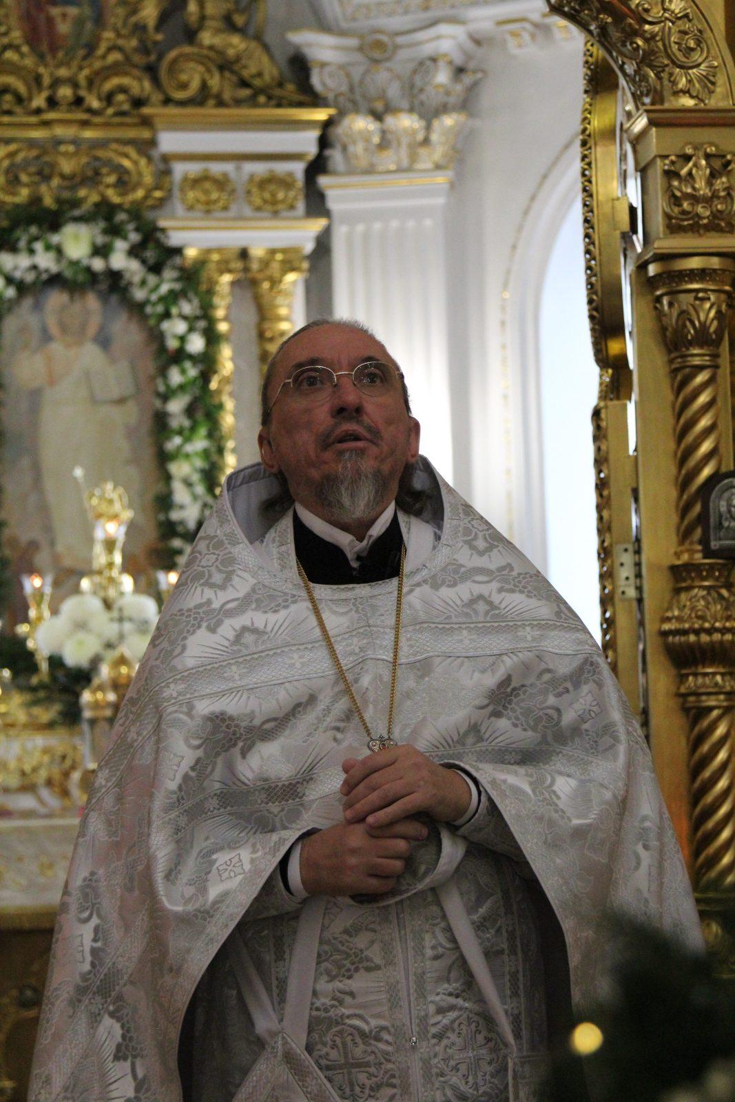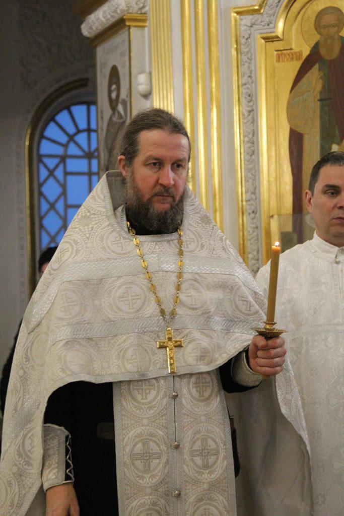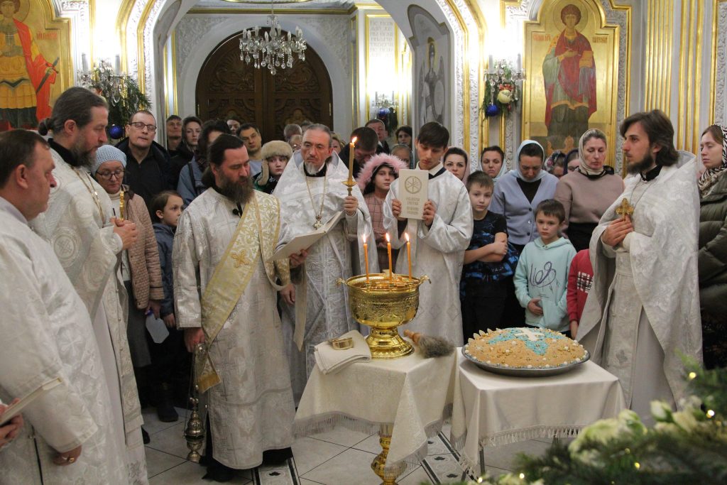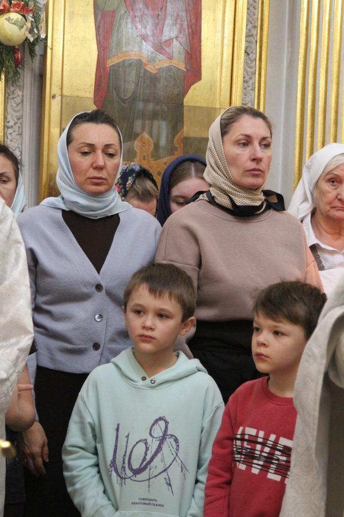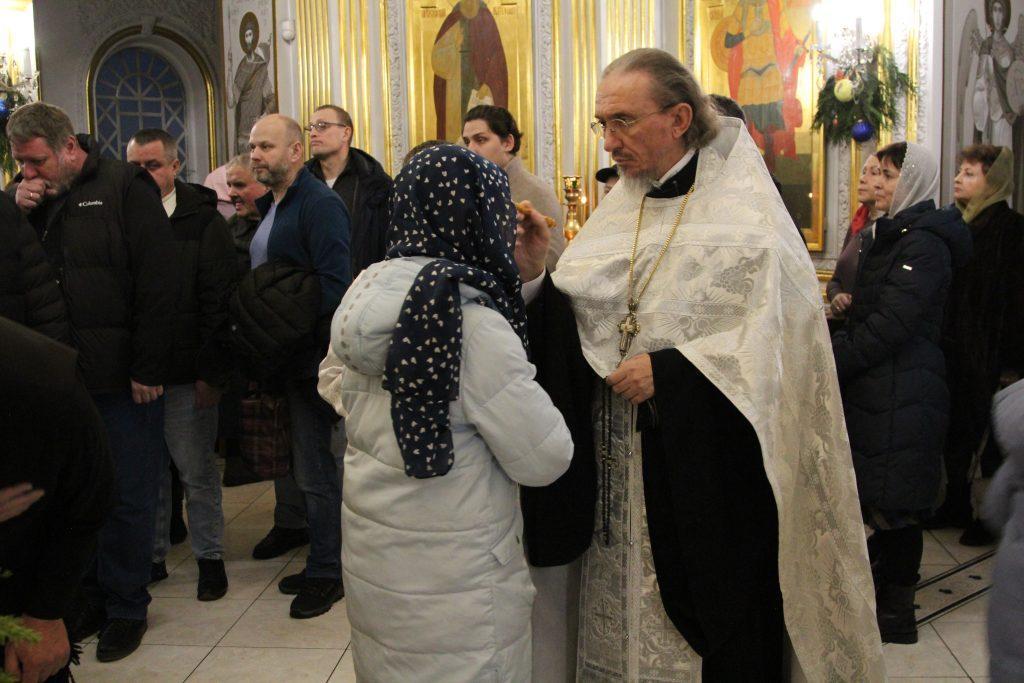 После отпуста настоятель храма игумен Софроний (Есимов) обратился к прихожанам с пастырским словом и поздравил их с Воскресным днем и с на́вечерием Богоявление.