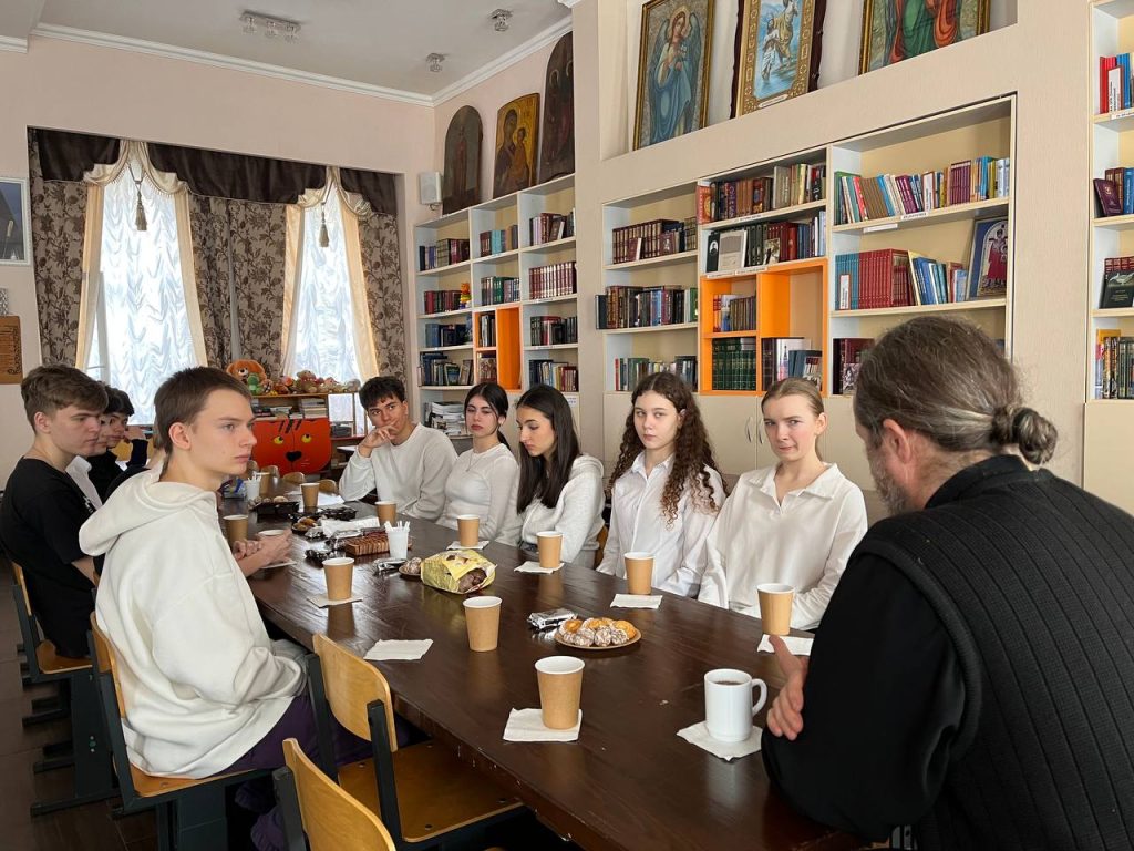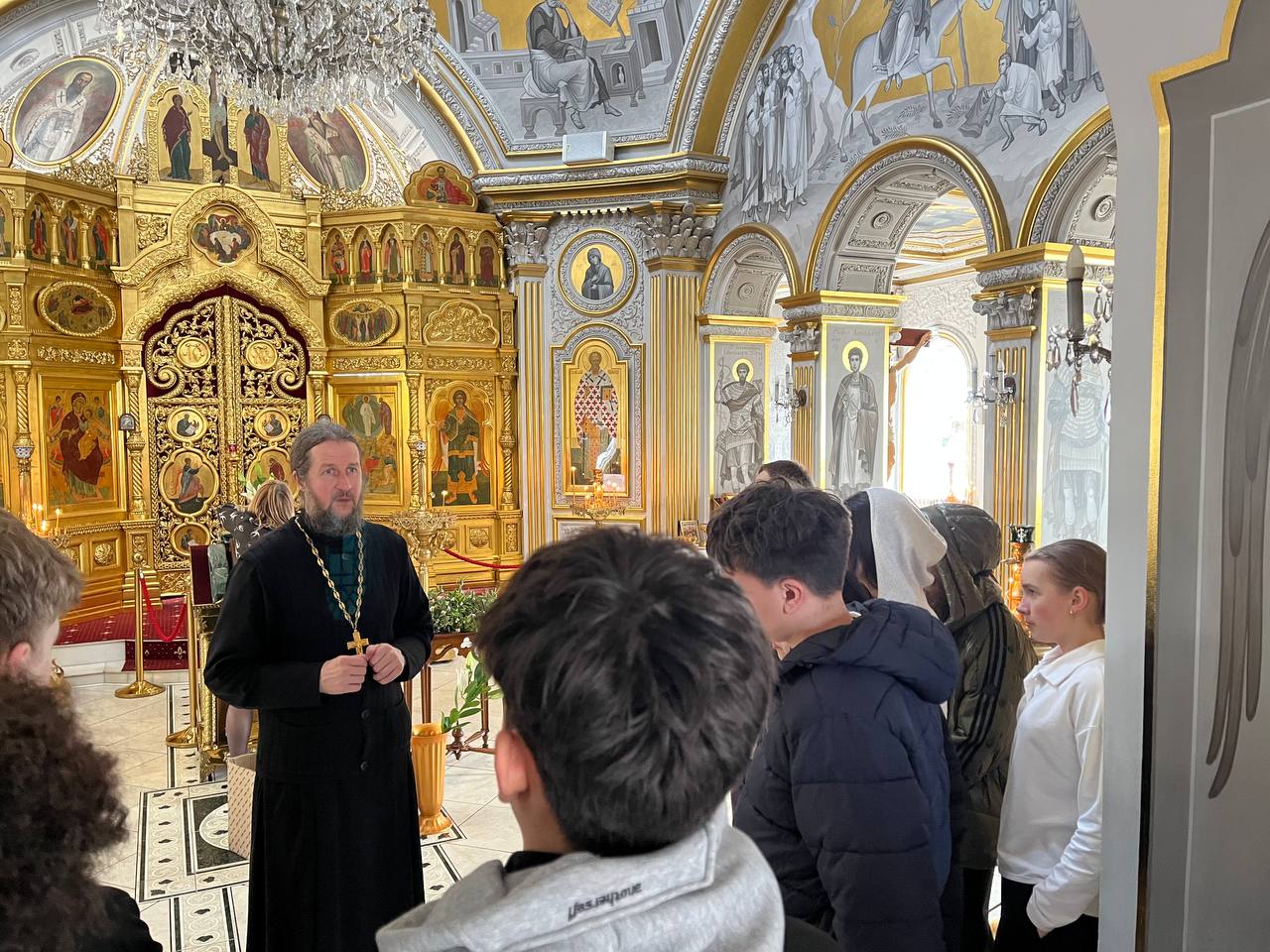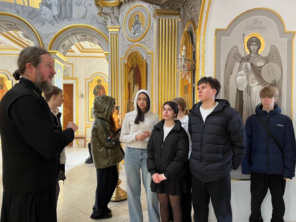 Встречу провел штатный клирик храма иеромонах Варсонофий (Куценко). Учащиеся и классный руководитель познакомились с многолетней историей храма, его архитектурными особенностями и особо чтимыми святынями.