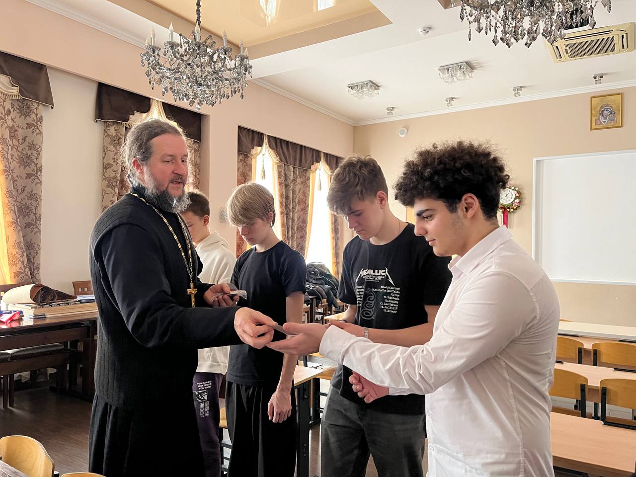 В завершение встречи иеромонах Варсонофий обратился к школьникам с напутственным словом, пожелав им помощи Божией в учебе и поиске своего призвания, и подарил каждому на молитвенную память икону Преображения Господня.